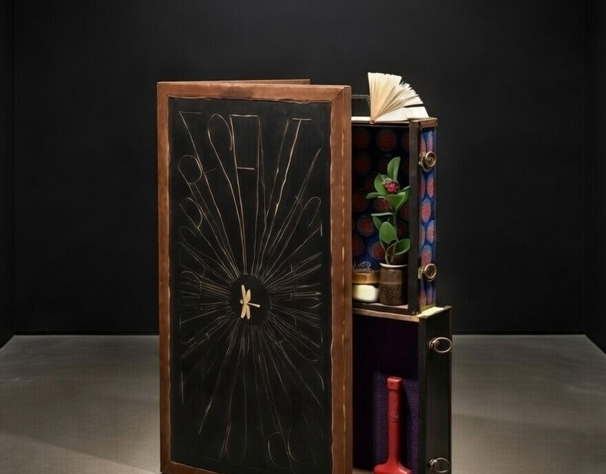 2024, Refinished table, books, flowers bronze butterfly. 37x50x24"