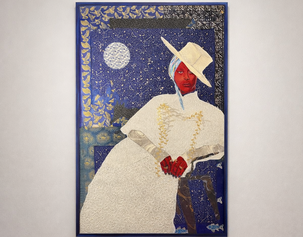 Portrait of Erykah Badu, 2023 Collage, Acrylic, paper on canvas 36"x60"
