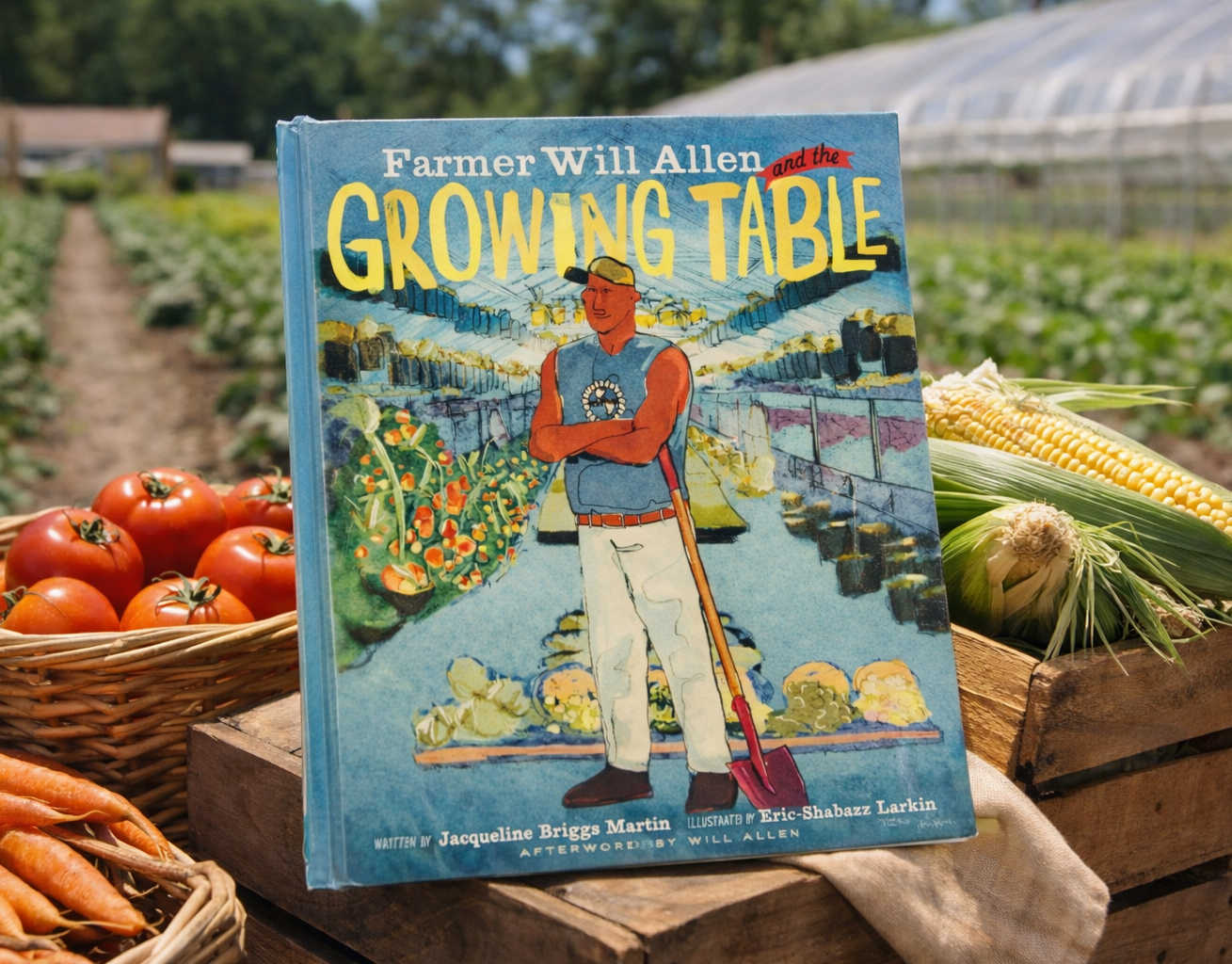 Farmer Will Allen and the Growing Table is a children’s book illustrated by Eric-Shabazz Larkin and written by Caldecott Medal–winning author Jacqueline Briggs Martin. The book tells the story of urban farming pioneer Will Allen, whose vision transformed abandoned city land into thriving gardens that feed communities. Through bold, expressive illustrations, the book celebrates imagination, resilience, and the power of growing food together.